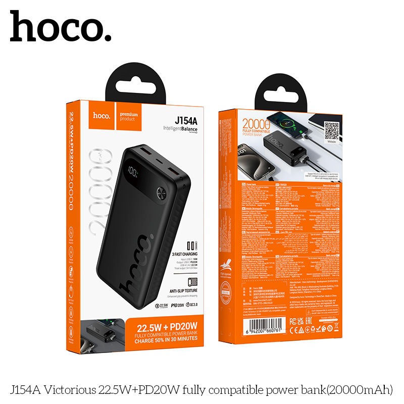 HOCO J154A sở hữu pin lithium polymer có dung lượng 20,000mAh tùy chọn, đủ để sạc nhiều lần cho điện thoại thông minh hoặc các thiết bị khác. Với tuổi thọ pin lên đến ≥300 lần sạc, bạn có thể sử dụng sản phẩm trong thời gian dài mà không phải lo lắng về việc thay thế pin.