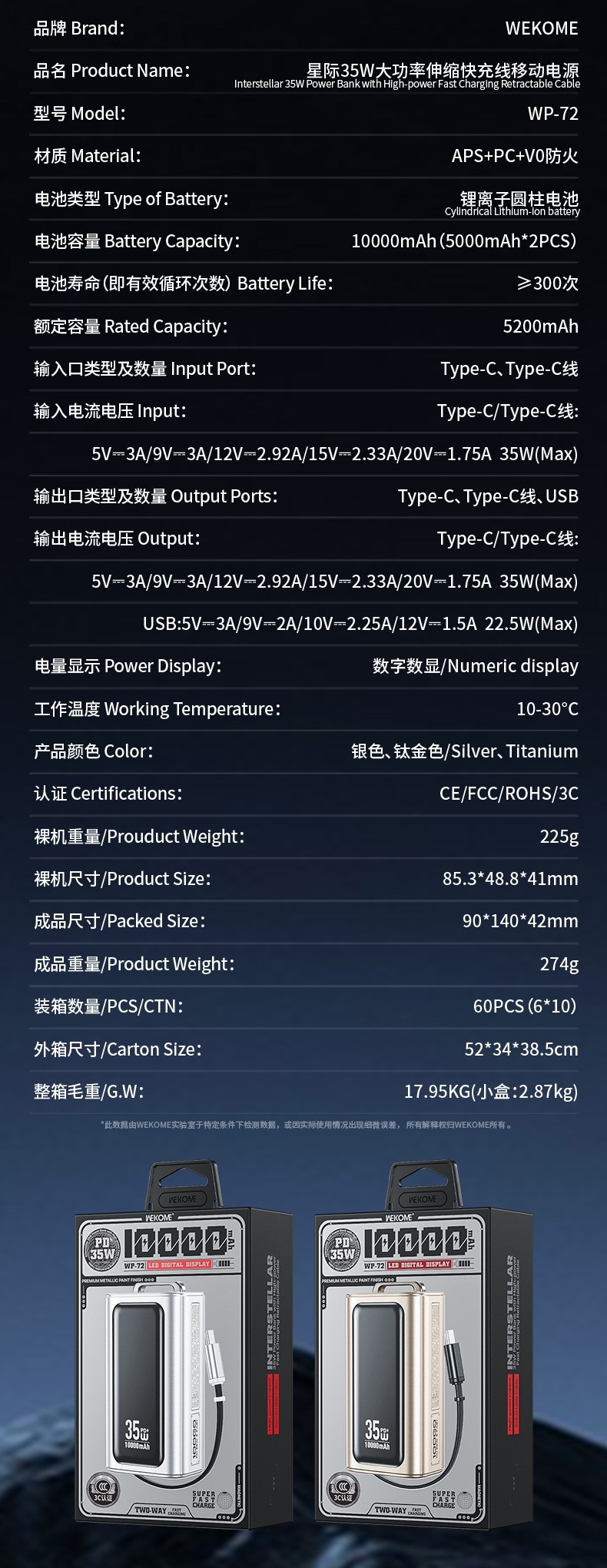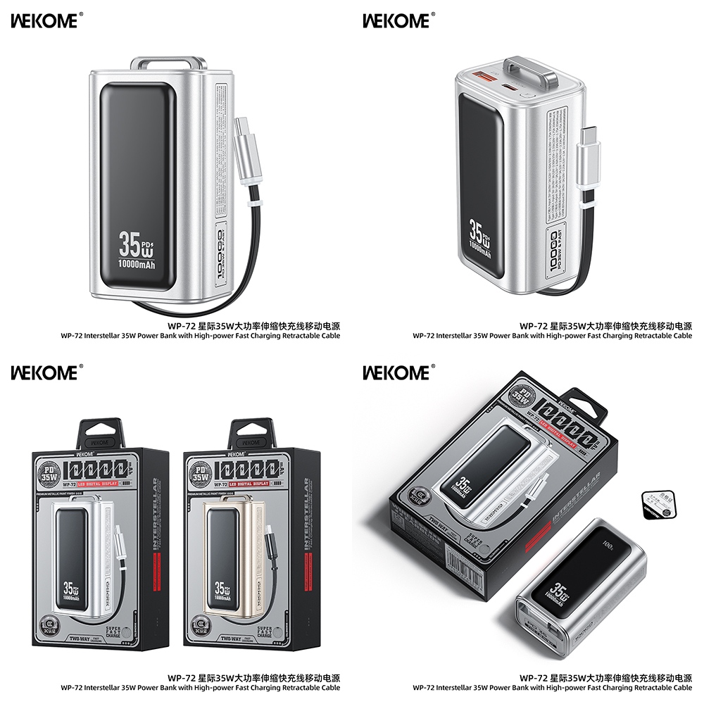 Pin sạc dự phòng mini Wekome WP-72 10000mAh lõi pin 21700, Cáp TypeC và Cổng TypeC In/Out PD 35W, USB-A QC 22.5W