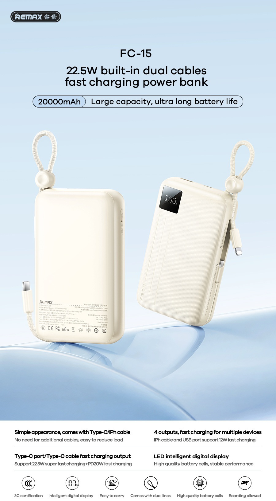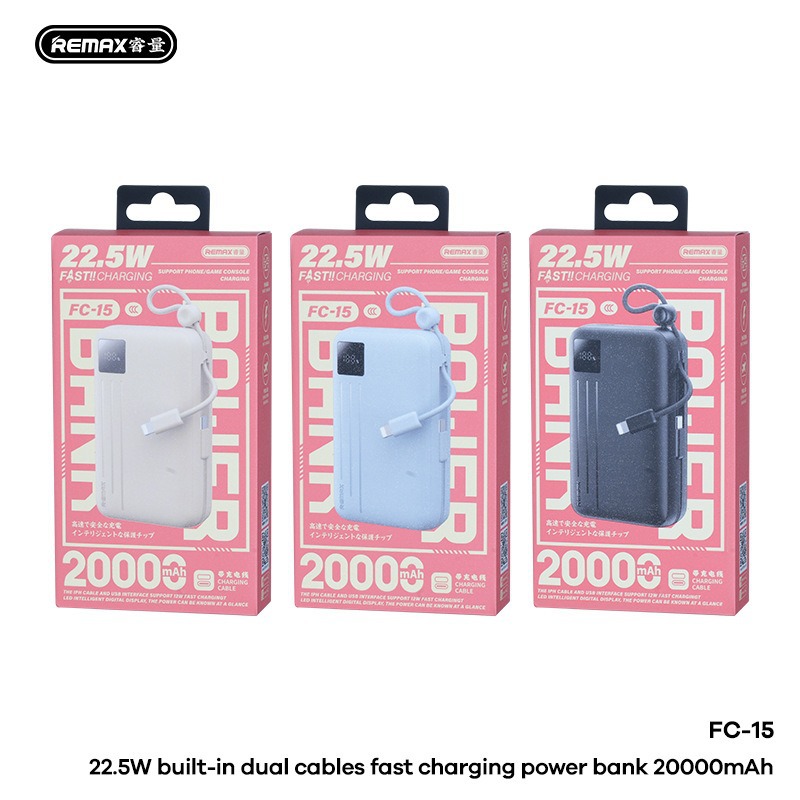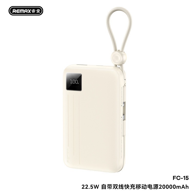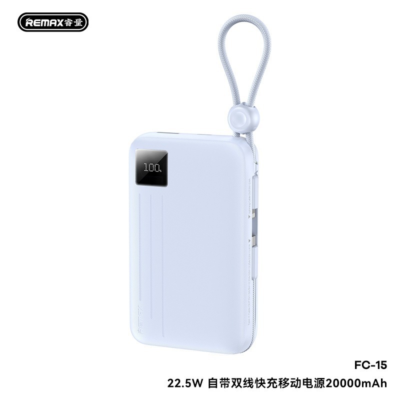 Sạc dự phòng Remax FC-15 20000mAh, TypeC PD 22.5W, Màn hình LCD, Kèm 2 cáp TypeC & Lightning