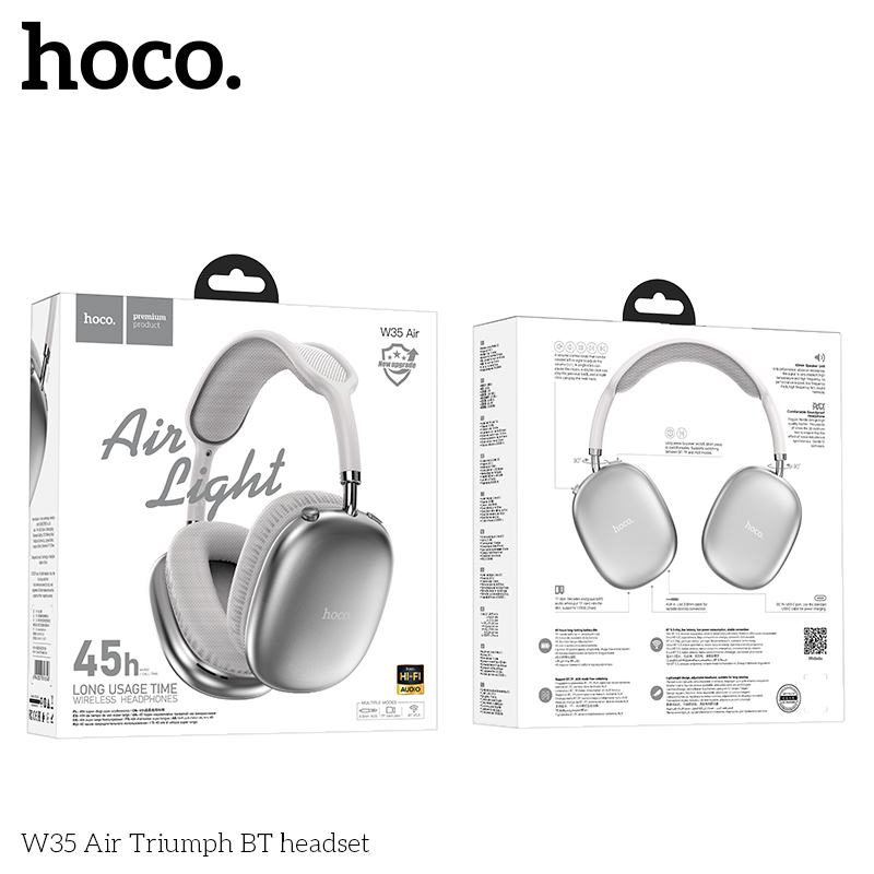 Về thiết kế, tai nghe Hoco W35 Air sở hữu ngoại hình học hỏi từ dòng tai nghe cao cấp AirPods Max. Đi kèm với 4 màu cực sành điệu là đen, xanh dương, xanh lá và bạc, phù hợp với mọi nhu cầu và sở thích của người dùng.