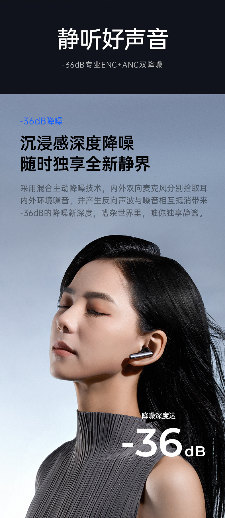 Giảm tiếng ồn chủ động ANC và giảm tiếng ồn môi trường bên ngoài ENC được sử dụng để thu tiếng ồn ở các dải tần số khác nhau với micro giảm tiếng ồn có độ chính xác cao và bộ phận cuộn dây chuyển động sẽ phát ra sóng giảm tiếng ồn ngược, triệt tiêu lẫn nhau sau khi xếp chồng lên nhau. Và bạn sẽ có không gian yên tĩnh để tận hưởng các bài hát yêu thích hay đàm thoại sắc nét với mọi người.