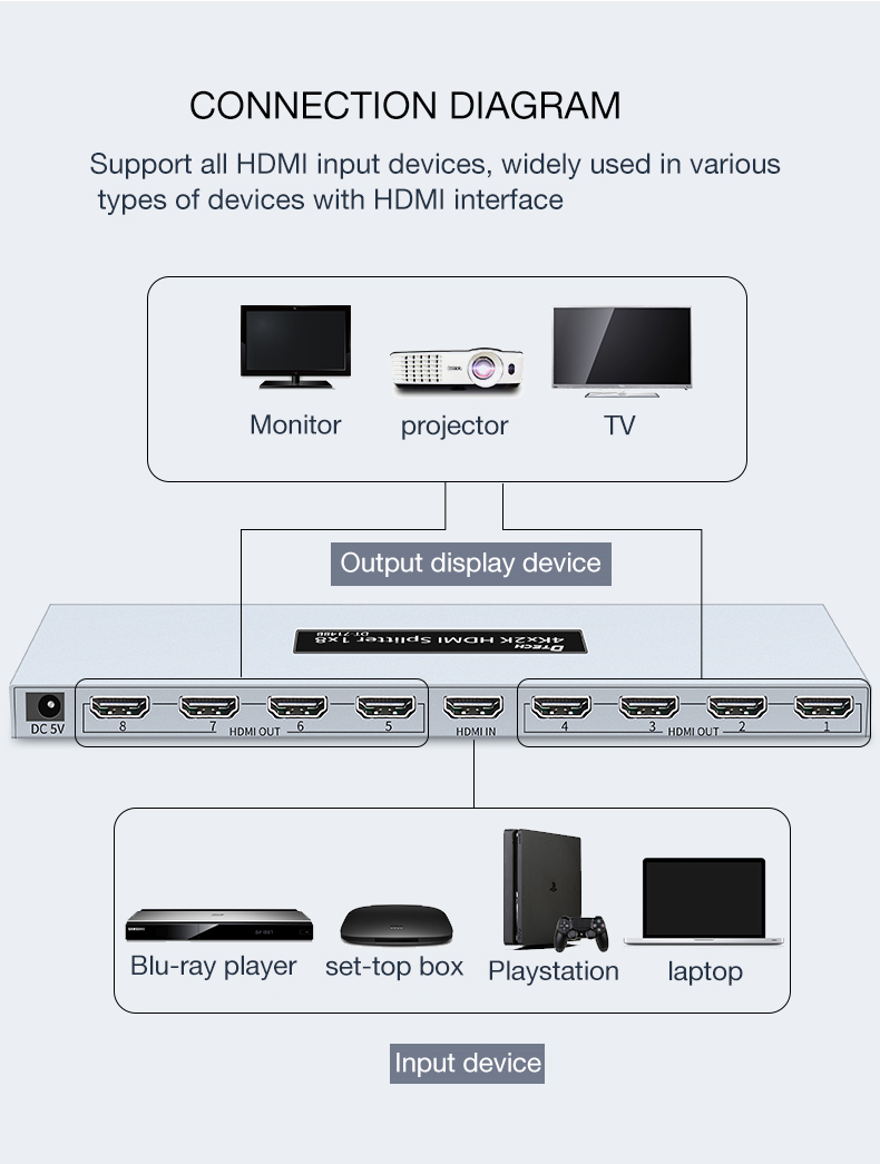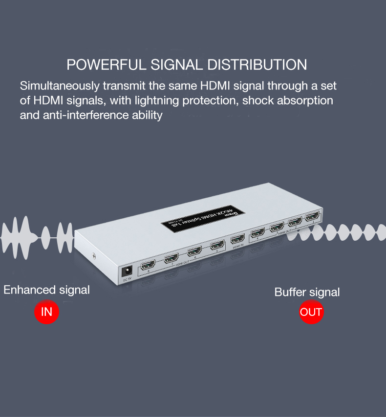 Cổng kết nối: 1 cổng nguồn, 1 HDMI (in), 8 HDMI (out)