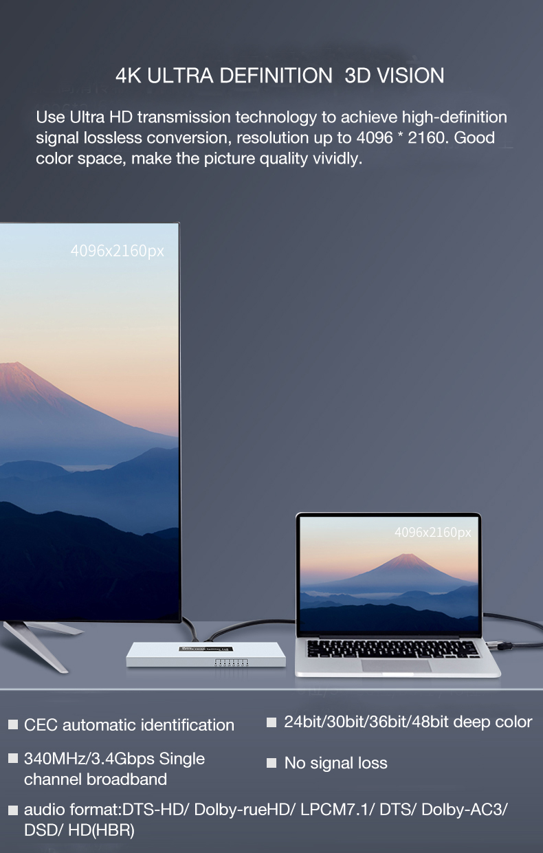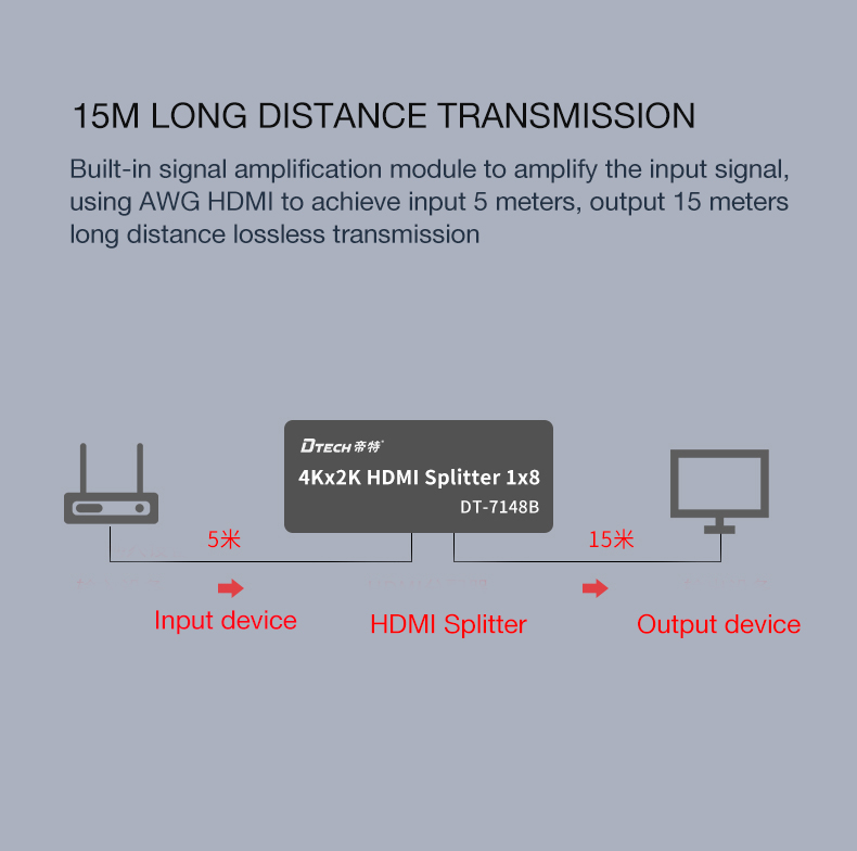 9 .Hỗ trợ đầu vào dài tới 15 mét Chiều dài cáp tiêu chuẩn AWG26 HDMI,